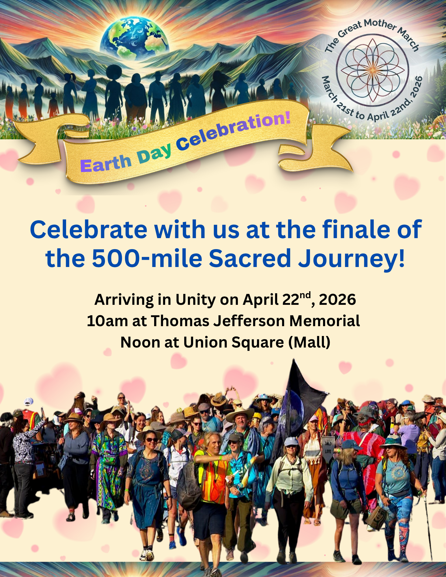The Great Mother March (GMM) will begin on Spring Equinox, 2026, leaving Asheville, NC on March 22nd on Her way to the U.S. Capitol Steps, arriving April 22nd, 2026. We will also celebrate the event in Asheville with a Kick-off Festival on March 21st, 2026.