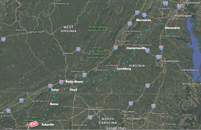 Then, we make our way to Lynchburg, arriving on 4/9, up Hwy 29 to Waynesboro, arriving 4/12.